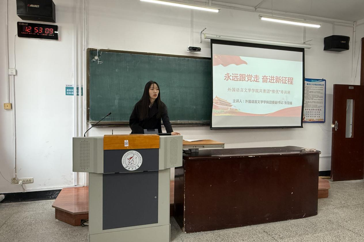 2025年10月11日中午,外国语言文学学院(区域国别学院)在二号楼106教室举办第六十期共青团“推优”学院层面培训班。本期培训由学院团委副书记张雪晴主讲,学院第六十期共青团“推优”培训班全体学员参加培训学习。