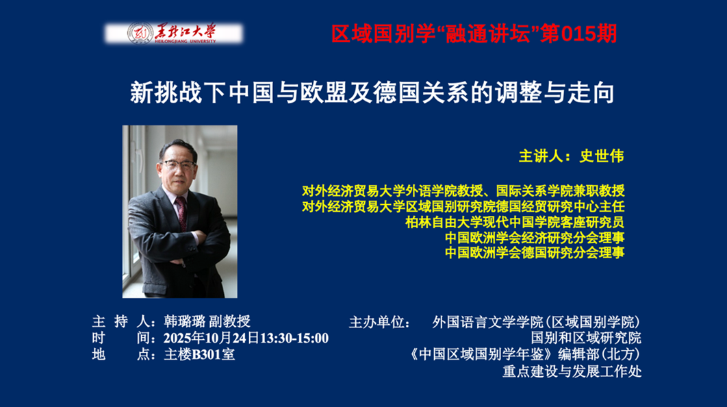 2025年10月24日下午,黑龙江大学外国语言文学学院(区域国别学院)品牌学术活动——区域国别学“融通讲坛”第015期,在主楼B座301会议室成功举办。本次讲坛特别邀请到对外经济贸易大学区域国别研究院德国经贸研究中心主任史世伟教授担纲主讲,以“新挑战下中国与欧盟及德国关系的调整与走向”为主题展开深度分享。外国语言文学学院(区域国别学院)副院长韩璐璐副教授主持,学院以及兄弟院校数十位师生齐聚现场。