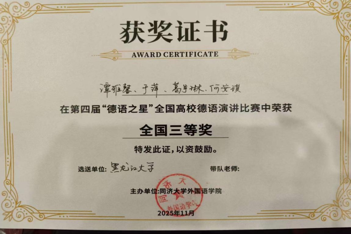 11月8日,第四届“德语之星”全国高校德语演讲比赛在同济大学圆满落下帷幕。经过初赛与决赛的激烈角逐,黑龙江大学外国语言文学学院德语系本科生于萍、葛宇琳、何安琪、谭雅馨四位同学组成的代表队脱颖而出,凭借扎实的语言功底、严谨的逻辑结构与沉稳的现场表现,最终荣获全国三等奖,德语系王艳玲老师获得优秀指导教师奖。此次获奖不仅展现了黑大学子的青春风采与专业素养,更彰显了德语系长期以来深耕人才培养、打造优质教学体系的丰硕育人成果。