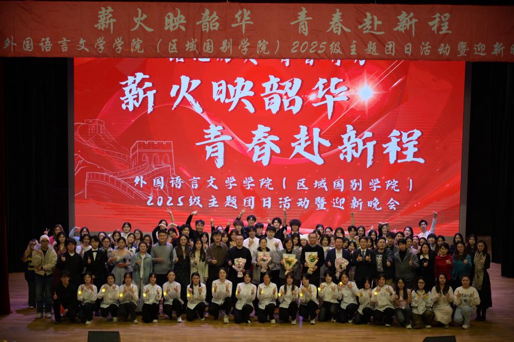 青春逢盛会,逐梦启新程。11月24日晚,黑龙江大学外国语言文学学院(区域国别学院)“薪火映韶华,青春赴新程”2025级主题团日活动暨迎新晚会顺利举行。活动分为“潮涌·赤子心向党”“韶华·奋斗志飞扬”“燃情·青春绽华光”三大篇章,以信仰、奋斗和梦想绘就了一幅激情澎湃的青春画卷。学院党委书记潘景文、院长黄萍、党委副书记邓洪健、副院长范海翔、韩璐璐、李晓光、各年级辅导员老师们及教师代表和2025级全体同学齐聚一堂,共同见证青春的昂扬和逐梦的启航!