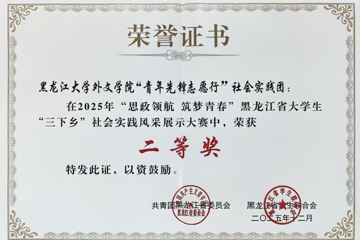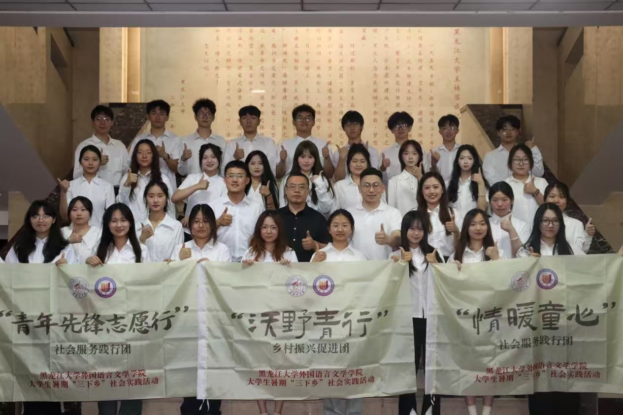 本次获奖是对学院长期以来坚持实践育人、深化“三全育人”工作成效的充分肯定。在学院党委副书记邓洪健的悉心指导下,由于洋、韩鹏、贾美微三位老师带队,外文学子于2025年暑期分赴双鸭山、密山、同江等地,开展社会实践活动。各实践团队紧密围绕“受教育、长才干、作贡献”的目标,深入基层一线,在理论宣讲、爱心支教、乡村振兴、生态环保、敬老志愿等多领域主动作为。学子们将专业所学与国家发展需求相结合,用实际行动服务乡村振兴,传承红色基因,诠释了新时代青年的责任与担当,生动践行了“请党放心,强国有我”的青春誓言。