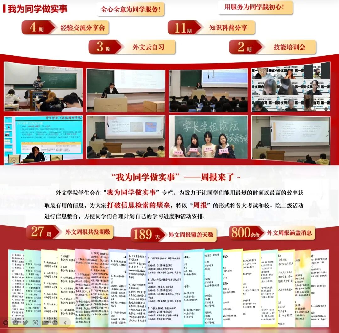 外文学院学生会始终秉承“全心全意为同学服务”的宗旨,扎实推进“我为同学做实事”系列活动。全年累计发布校会投稿2期、周报27期,开展知识科普11期,组织外文云自习3期、技能培训2期、经验交流分享会4期、赛程分享3期。这些服务项目覆盖学业互助、生活关怀、技能提升、信息共享等多个领域,切实回应学生需求,增强了学生组织的凝聚力与亲和力,真正做到了“想同学所想,急同学所急”。