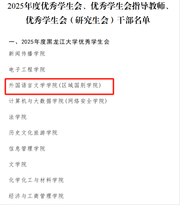 外国语言文学学院(区域国别学院)学生会干部陈昶文、代与男、邓仁慧、丁博晗、董畅、汪欣悦、王文新、杨程宇、岳海龙9人获得“2025年度黑龙江大学优秀学生会干部”荣誉称号。