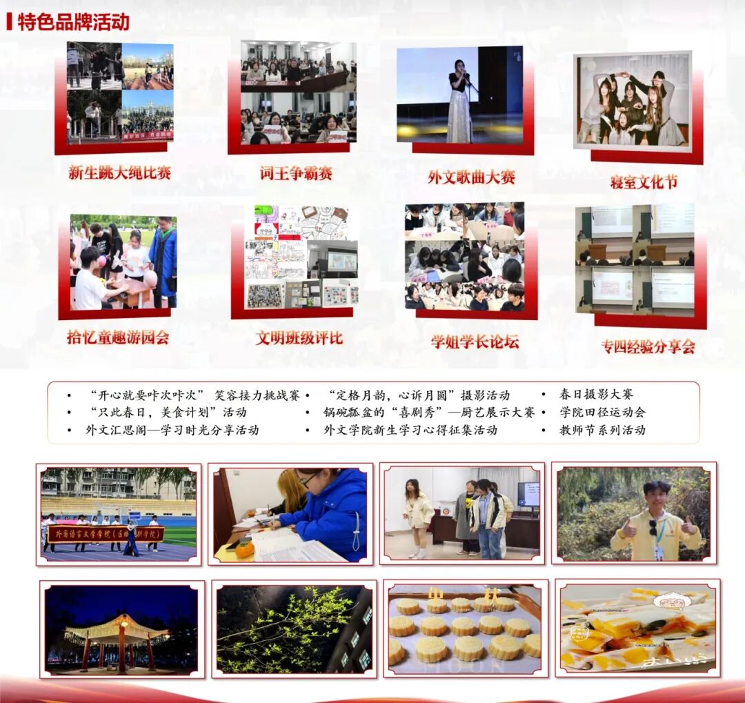 围绕学院专业特色与学生成长需求,外文学院学生会精心打造多项品牌特色活动。学生会各部门结合自身职能,开展了“外文学院文明班级评比”、“一站式”学生社区文化节、外语节等一系列具有外文特色的品牌活动,并在毕业季、迎新季等重要时间点组织开展主题鲜明、形式丰富的系列活动。这些活动不仅彰显了学院文化,也为学生提供了展示自我、锻炼能力的平台,有效促进了学生综合素质的提升。