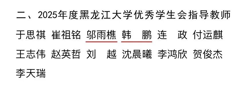 外国语言文学学院(区域国别学院)学生会指导教师邬雨樵、韩鹏荣获“2025年度黑龙江大学优秀学生会指导教师”荣誉称号。