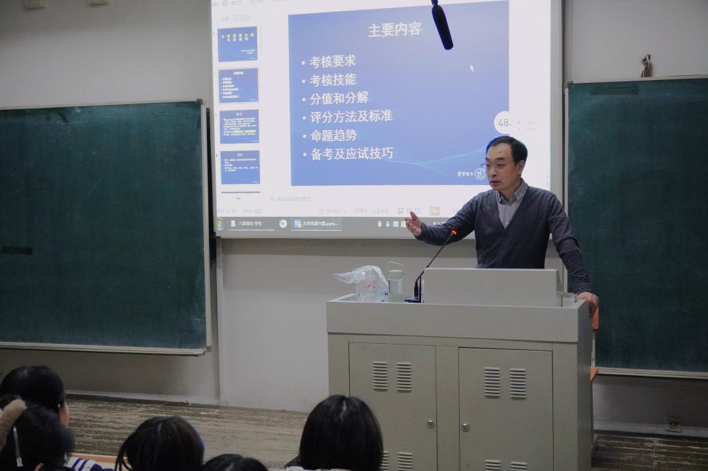 12月3日,六级专场辅导在2号楼400教室举行。徐德凯老师以一首轻松生动的英文歌曲引入,通过现场互动了解同学们的备考疑惑,并重点围绕听力、写作与阅读三大板块展开系统讲解。他结合历年真题,从作文结构搭建与语言优化,到阅读的略读、扫读与精读策略,逐步解析各题型的核心难点与应答技巧,并提供了实用的时间分配建议。活动结束后,徐老师还向同学们分发了独家整理的备考资料,为大家的复习冲刺提供了进一步支持。