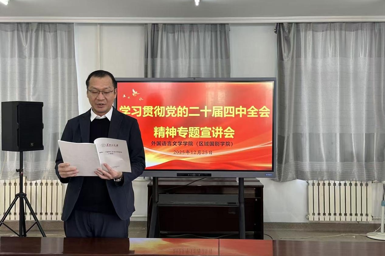 为深入学习领会、全面准确把握党的二十届四中全会精神的丰富内涵与核心要义,切实将师生党员的思想和行动统一到全会精神上来,2025年12月25日上午,外文学院在主楼B301召开学习贯彻党的二十届四中全会精神专题宣讲会,学院党委书记潘景文进行宣讲。