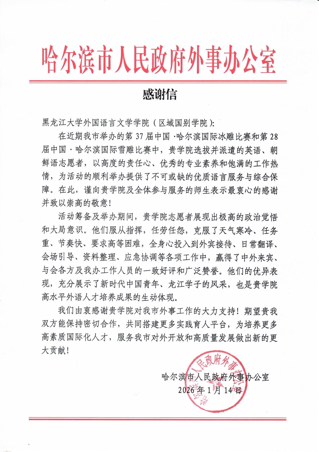 以下是哈尔滨市人民政府外事办公室对我院的感谢信: