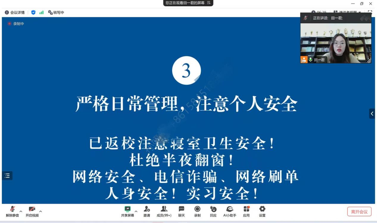 会议伊始,田一君老师对分专业实习安排工作进行解读,详细梳理了各语种实习的具体时间、对接负责人及核心流程,明确了校友邦平台填报、实习日志与报告提交的规范要求,提醒全体同学务必注意人身安全、财产安全、操作安全、交通安全、防范诈骗、通讯畅通等,若遇紧急情况及时联系家长及辅导员老师。在实习过程中鼓励大家积极适应工作节奏,同时积极面对当下的就业环境,理性择业、努力实现更高质量、更充分就业。同时,针对近期相关安排与时间节点,田老师强调了补缓考的关键信息与备考要求,全体同学要自觉维护优良学风建设,自觉遵守考试纪律,做到诚信应考,杜绝任何考试违纪和作弊行为,同时督促同学们对照培养表自查进度、及时补缺。在日常管理与安全防范方面,她重点警示电信网络诈骗风险,提醒学生警惕刷单、培训贷等陷阱,严守个人信息与资金安全底线。