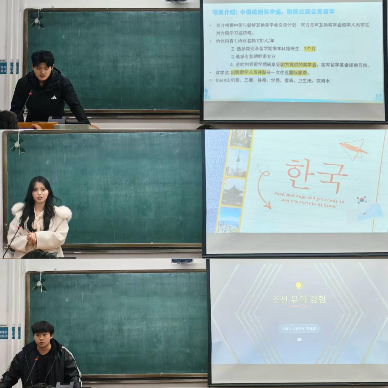 为助力朝鲜语专业学子明晰专业发展方向、锚定留学升学目标,搭建优质的经验分享与交流平台,2025级朝鲜语系于3月24日在二号教学楼举办留学经验交流会。本次会议由朝鲜语教研室主任崔虎男主持,朝鲜语系主任李勇根、2025级朝鲜语专业辅导员秦旭妍出席活动。本次交流会特邀2023级祁新昊、2023级王君瑞、2024级朱弋敔作为分享嘉宾。