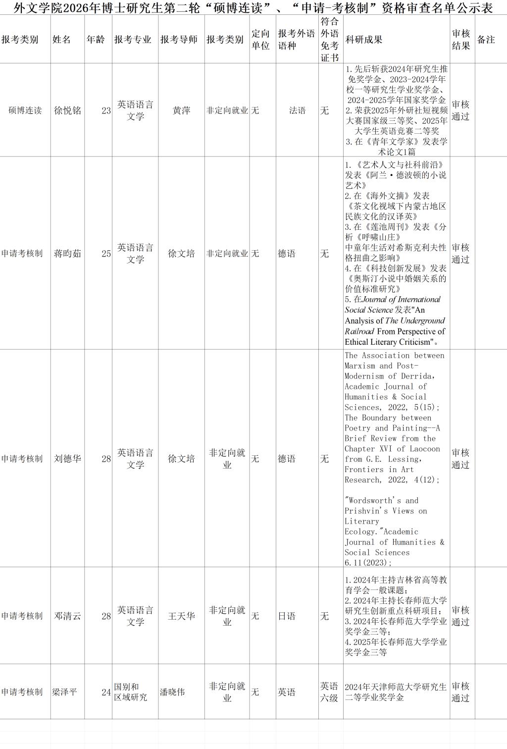 外文学院2026年博士研究生第二轮“硕博连读”、“申请-考核制”资格审查名单公示表